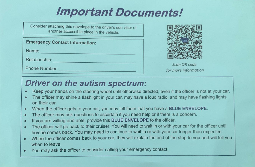 The program provides individuals with a blue envelope that they can keep in their vehicles in the event of a traffic stop or interaction with law enforcement. The specially designed envelope holds a driver’s essential documents — license, registration and a contact card — and is recognizable by trained law enforcement. Instructions for both the driver and the officer conducting the motor vehicle stop are printed on the envelope to reinforce calm, positive interactions between drivers with autism and police officers.